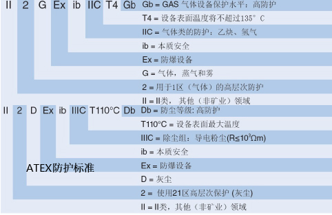 防爆标识例:ExibIIBT3其中Ex为防爆标志;ib---为本质安全型设备类型可用于安全分区的1区和2区;IIB为电气设备分类,又分IIA,IIB,IIC分级其中IIC为氢气防爆级产品;T3为温度组别,它对设备得ZUI高表面温度进行分组,分T1--T6其中T6为设备ZUI高要求等级。