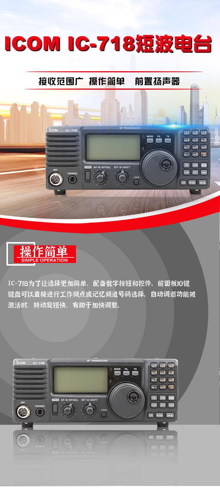 操作简单  IC-718 为了让选择更加简单,配备数字按钮和控件。前面板10键键盘可以直接进行工作频点货记忆频道号码选择。自动调谐功能被激活时,转动旋钮块,有助于加快调整.