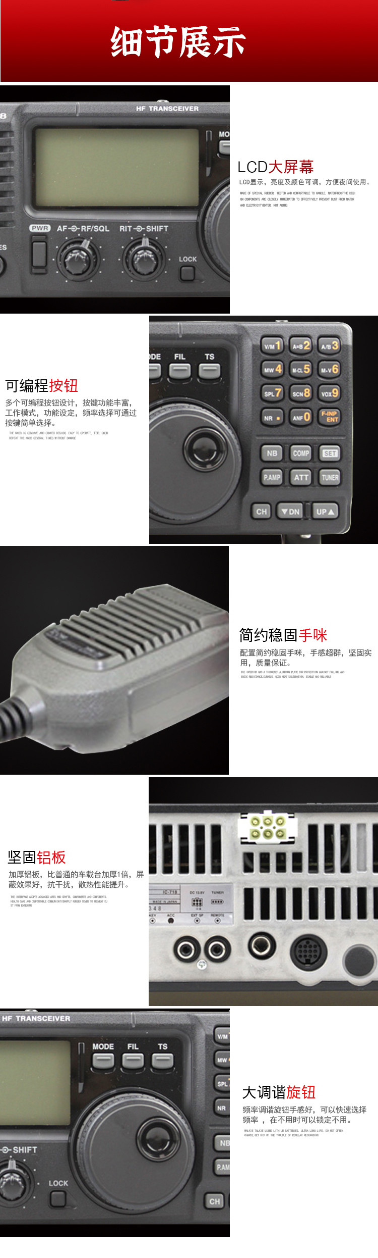 100W发射功率,大调谐旋钮频率调谐旋钮手感好,可以快速选择频率,在不用时可以锁定不用。加厚铝板,比普通的车载台加厚1倍,屏蔽效果好,抗干扰,散热性能提升。