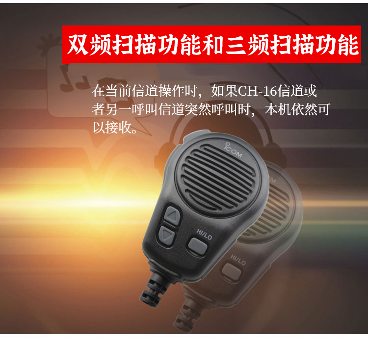 双频扫描功能和三频扫描功能  在当前信道操作时,如果ch-16信道或者另一呼叫信道突然呼叫时本机依然可以接收。