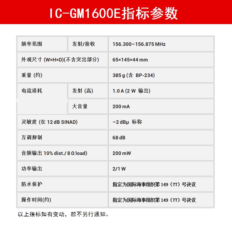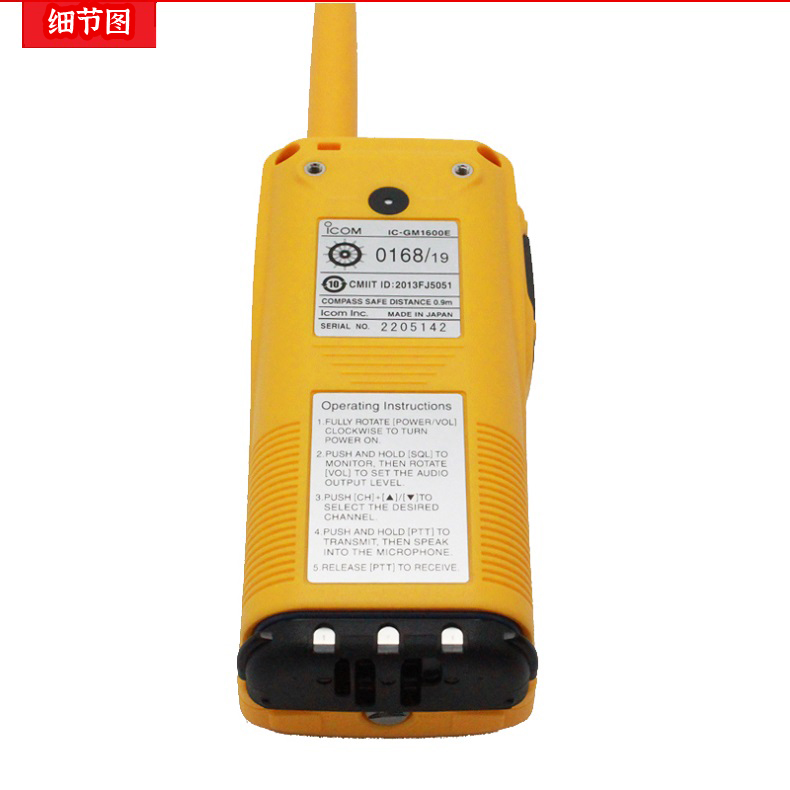 超低温条件下同样耐用,在-20℃条件下3300mAh锂电池(BP-234)工作时间超过8小时 ,可提供中国船籍社(CCS)证书【证书单独付费,周期不短,购买前请先与客服联系确认证书提供周期】,是GMDSS设备之一。