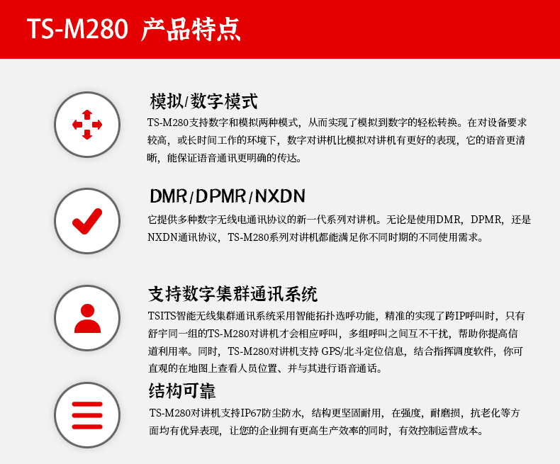 数模兼容车载台,兼容市面大多数的通讯方式 数字集群系统,组网通讯,保密性更加。 GPS/北斗定位 中文显示 IP67防水等级,水深1米,可以放置30分钟。