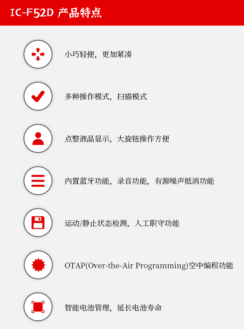 小巧轻便,更加紧凑 多种操作模式,扫描模式,使得扫描信道更方便。 点阵液晶显示,大旋钮操作方便 录音功能,有源噪声抵消功能,减少干扰。 人工职守功能,方便工作需要。