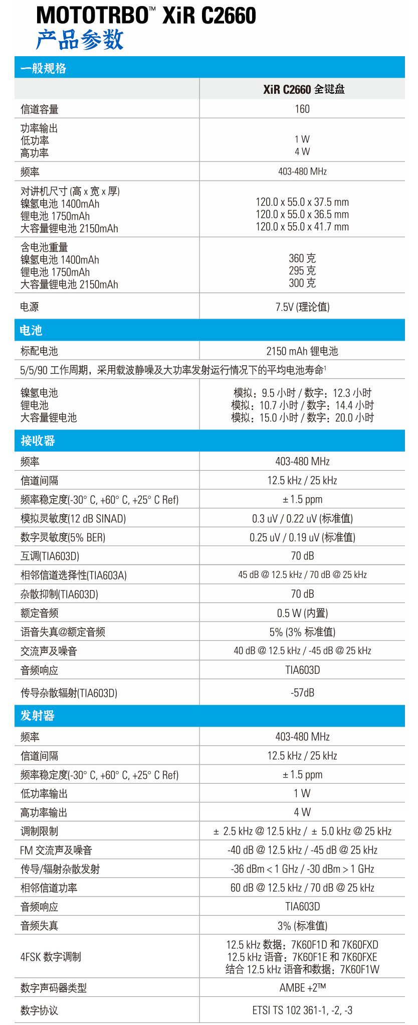 性价比卓越的XIR C2660对讲机提供数字技术带来的诸多好处一在数字模式下,比模拟对讲机增加40%的通话时长、12.5kHz带宽双倍语音容量、 更好的音频性能。MOTOTRBO对讲机在整个通话范围内将提供更清晰的语音通讯,不再有模拟机型中的静电和背景噪音。