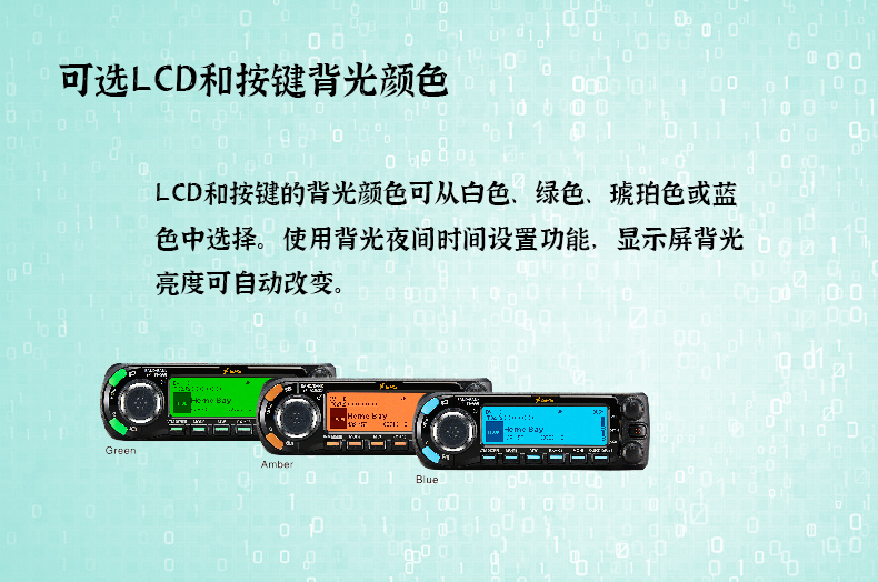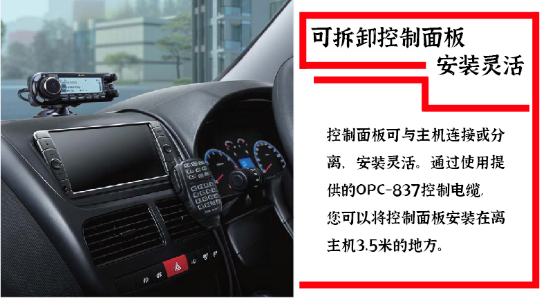 宽带接收,U/V双段发射,数模业余电台,LCD 4色背光显示和按键背光,内置GPS接收,控制面板与主机可分离,可插SD卡用于语音和数据的存储,输出功率50W。
